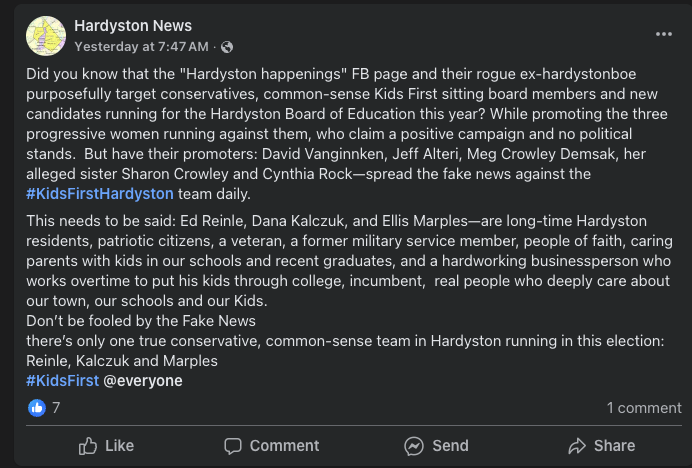 A recent post by an anonymous Kids First Hardyston supporter claims that I - along with several other community members - am spreading “fake news” to harm their campaign.